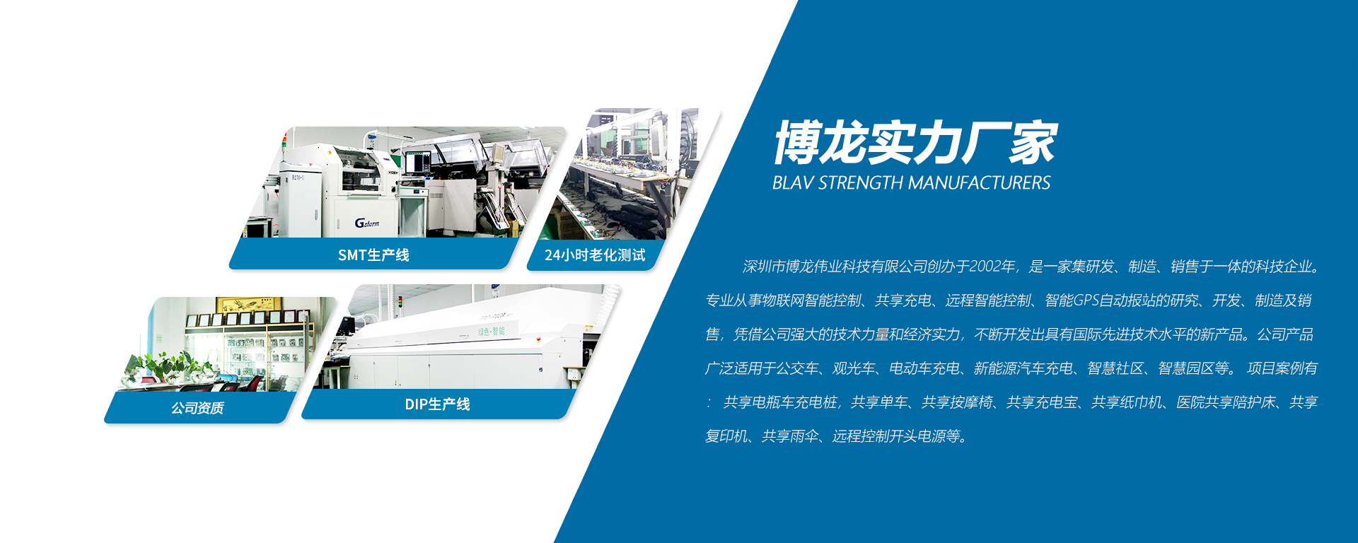 深圳市博龍偉業科技有限公司創辦于2002年,是一家集研發、制造、銷售于一體的科技企業。專業從事物聯網智能控制、共享充電、遠程智能控制、智能GPS自動報站的研究、開發、制造及銷售,憑借公司強大的技術力量和經濟實力,不斷開發出具有國際先進技術水平的新產品。公司產品廣泛適用于公交車、觀光車、電動車充電、新能源汽車充電、智慧社區、智慧園區等。 項目案例有: 共享電瓶車充電樁,共享單車、共享按摩椅、共享充電寶、共享紙巾機、醫院共享陪護床、共享復印 機、共享雨傘、遠程控制開頭電源等。